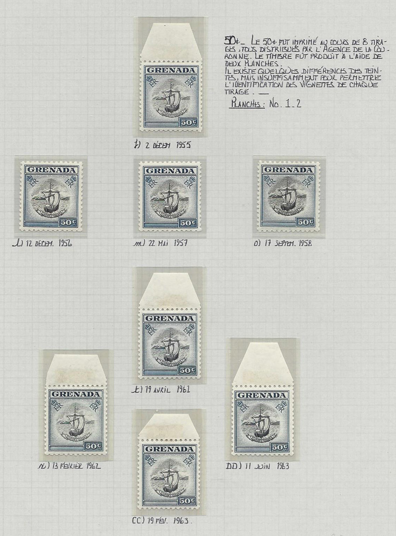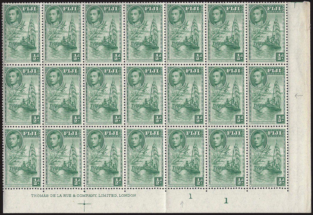 #117d, var (SG249b, 49ba) 1948 KGVI ½d green perf 12 block of 21 (7 x 3) with imprint and plate numbers, variety extra palm frond. Two stamps hinged, others including the variety NH. F-VF. (SG £160). PHOTO |