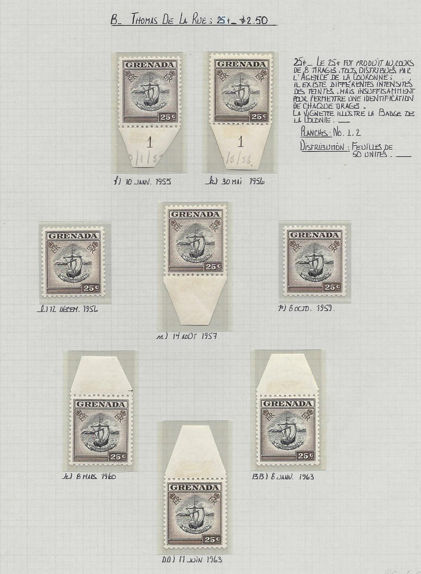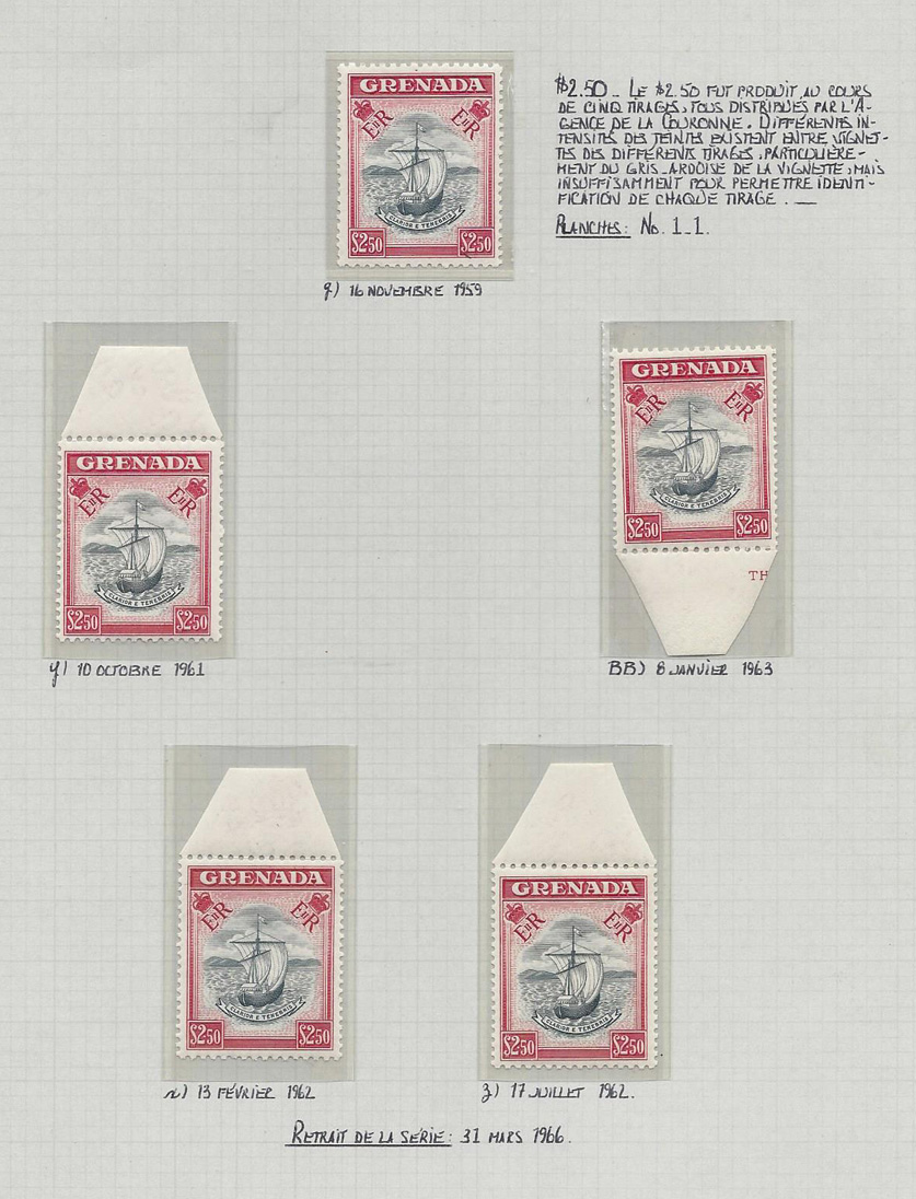 #C2-4, 7, vars (SG141-2, 42-43b, vars, CW A2, 2a//A7b) 1948//65 3p // 1/5 Air Mail group of 5 items, each with variety. Includes the 3d strip of 3 the middle stamp, variety major re-entry, the 6d margin block of 6, the LR stamp variety re-entry, 8d horizontal strip of 3, the right stamp, variety hand flaw, and the 1/5 a LL corner margin plate number block of 4 the UL stamp, variety cracked wall and a LR corner margin block, the LL stamp, variety retouch. All NH. F-VF. PHOTO |