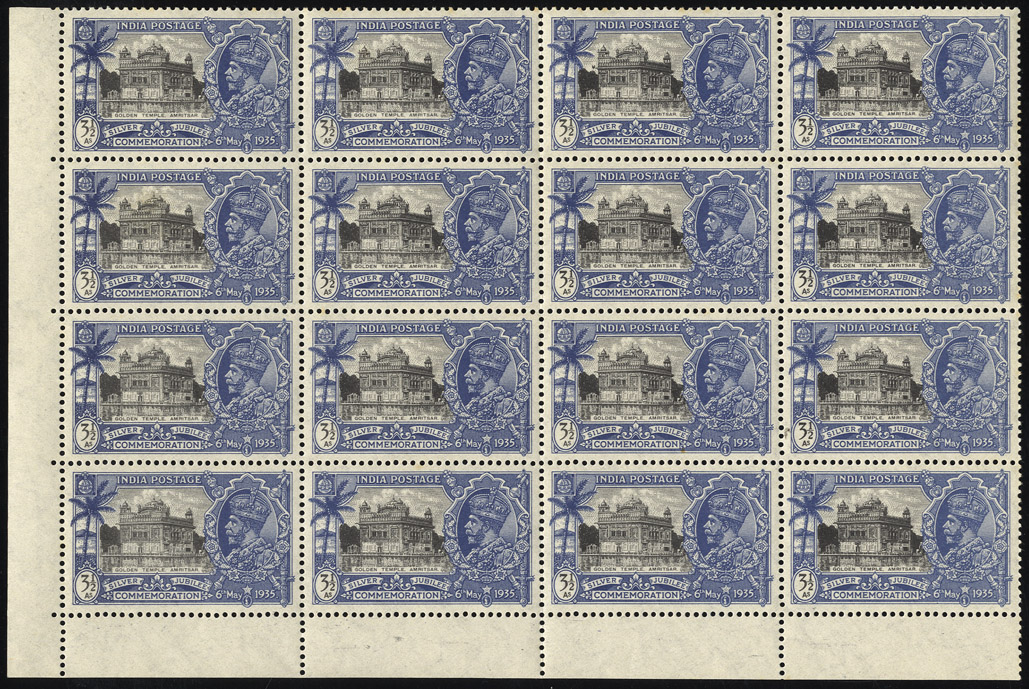 #147, 47a (SG245, 45a) 1935 KGV 3½a Silver Jubilee LL corner margin block of 16 (4 x 4), stars pointing right, stamp 3 in top row, variety bird flaw. NH. Fresh. F-VF. (SG £495). PHOTO. CLICK HERE to see full block. |