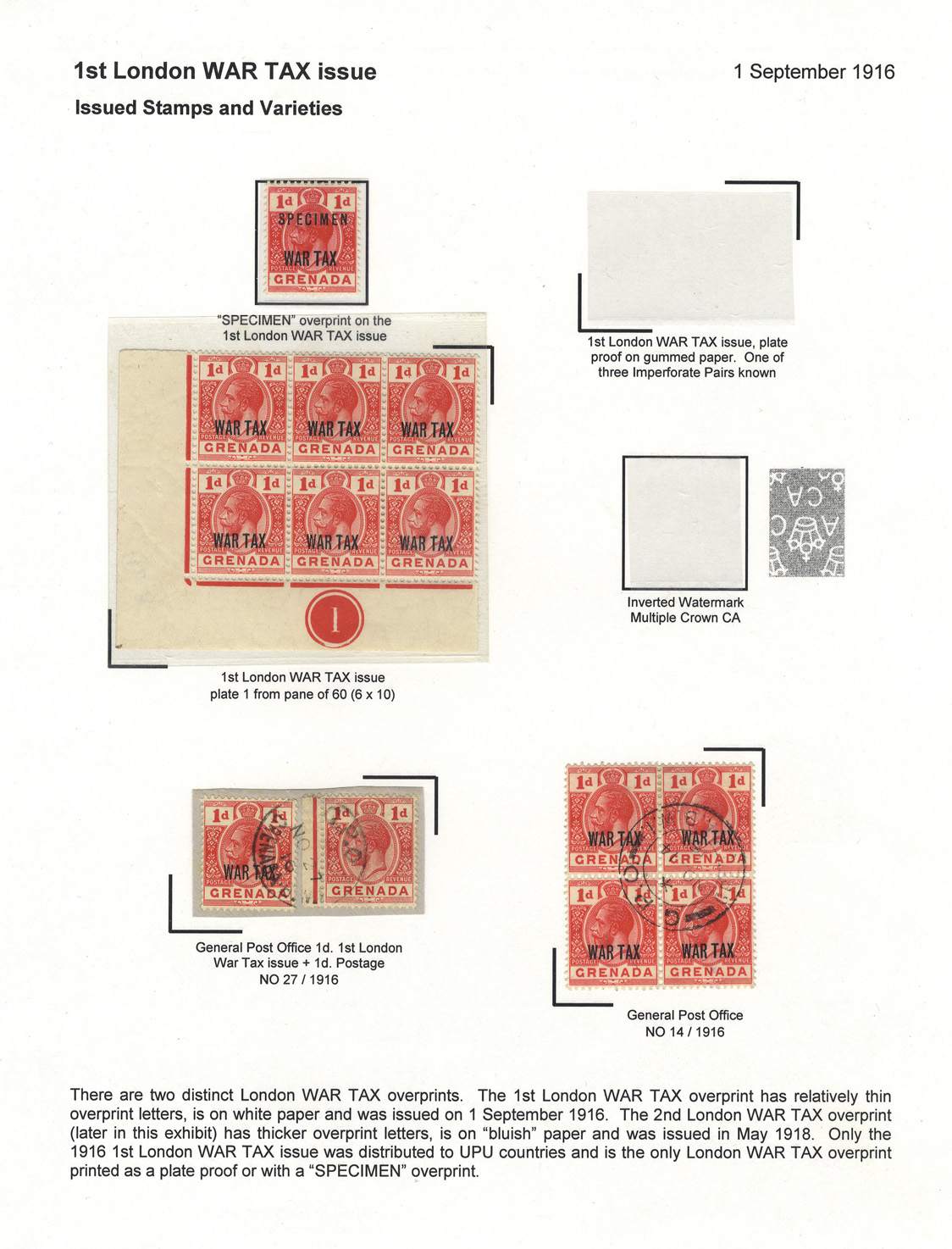 1916-19 KGV Collection of War Tax issues on exhibit pages and stock sheets consisting of Specimens, mint and used blocks of 4 and larger, mint and used varieties, complete left and right panes of the first issue with varieties and left pane of the second issue (toned). Also a group of used with varieties and various village cancels, part cover, interesting forgeries, etc. F-VF. Ex-Walker. (SG over £1,000). PHOTO 1 PHOTO 2 PHOTO 3 PHOTO 4 PHOTO 5 PHOTO 6 PHOTO 7 PHOTO 8 PHOTO 9 |