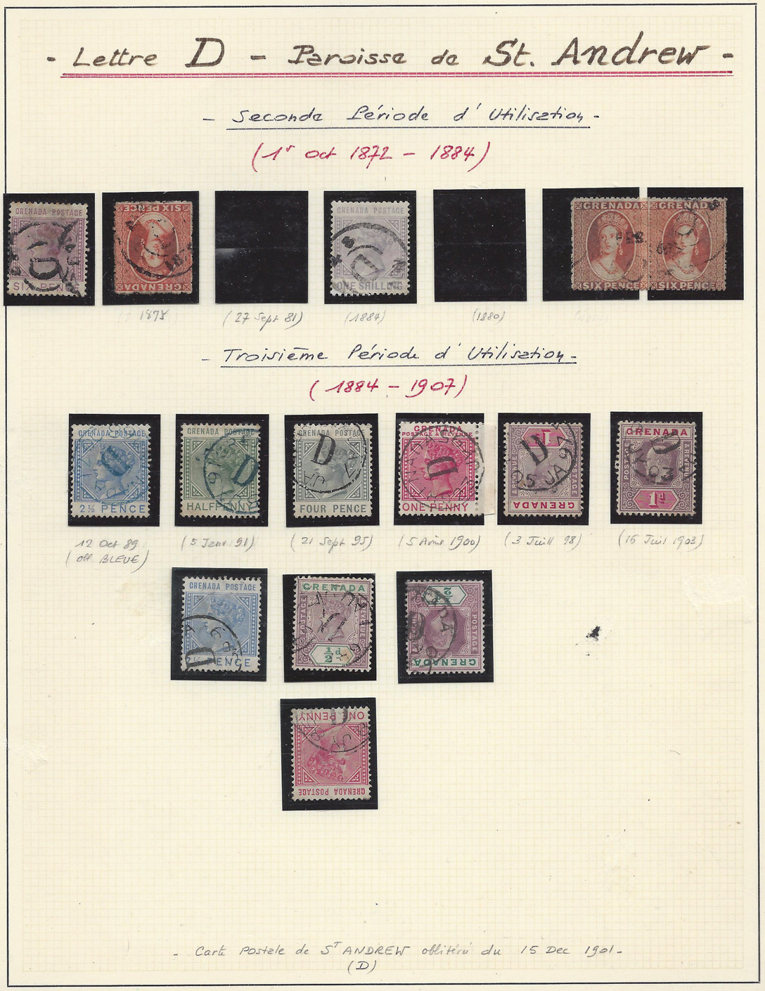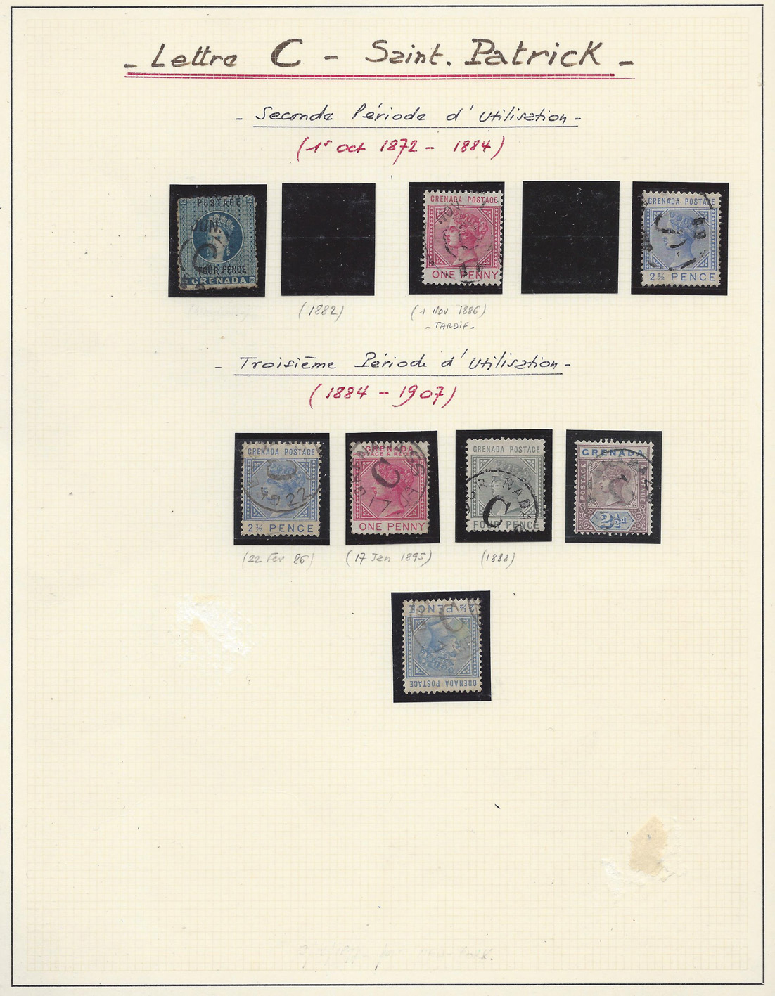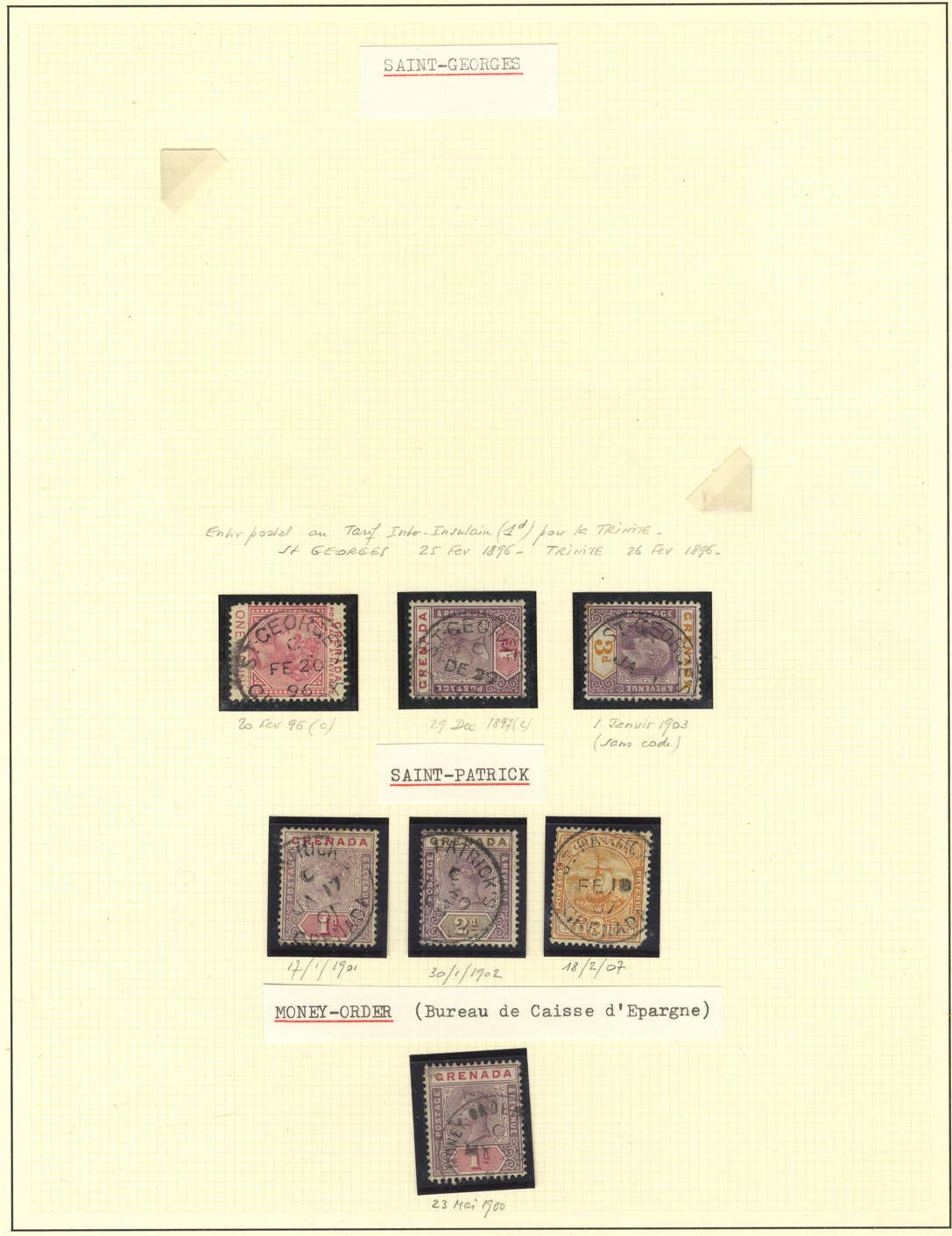 QV//KGV Cancellation collection on album pages and stock sheets consisting of 113 stamps, a little more than half bearing letters A though G from the second and third periods of use. The remaining are nearly all village cancels with Birch Grove, Carriacou, Concord, Crochu, Dunfermline, Gouyave, Grenville, Happy Hill, Hermitage, Petit-Martinique, St. Davids, St. Georges, St. Patrick, Snug Corner, and a Money Order cds. An excellent collection with many VF strikes. F-VF. See PHOTO 1 PHOTO 2 PHOTO 3 PHOTO 4 PHOTO 5 PHOTO 6 PHOTO 7 PHOTO 8 PHOTO 9 PHOTO 10 PHOTO 11 PHOTO 12 |