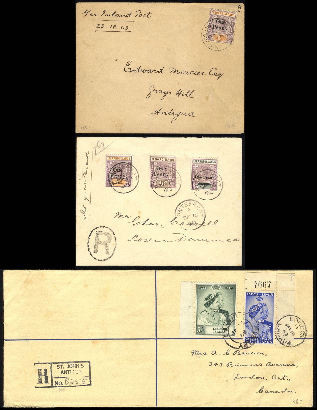 QV, KEVII, KGVI Odds and ends, with QV 1d on 4d - 1d on 7d set of 3 used to Roseau from Montserrat, QV 1d on 4d on commercial cover to Grays Hill Antigua cancelled St. Johns, KEVII ½d wrapper commercially used to Gracehill cancelled St. Johns and 1949 3d reg. envelope to Canada uprated with 2½d (sheet number 7667) and 5/ Silver Wedding cancelled St. Johns. All F-VF. PHOTO |