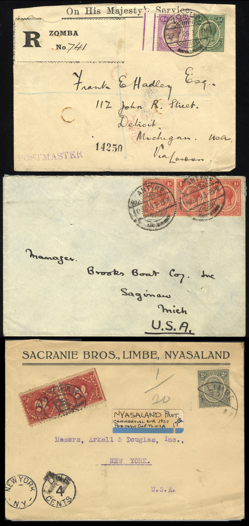 1912//35 KEVII//KGV Collection of 8 covers including KEVII with Zomba reg. hs, the rest all KGV with reg. Silver Jubilee OHMS, 2 other OHMS with Zomba reg. label, another to NY with “T” and US postage due affixed, FAM to Port Bell, Uganda. A couple cut down, others F-VF. PHOTO 1 PHOTO 2 |