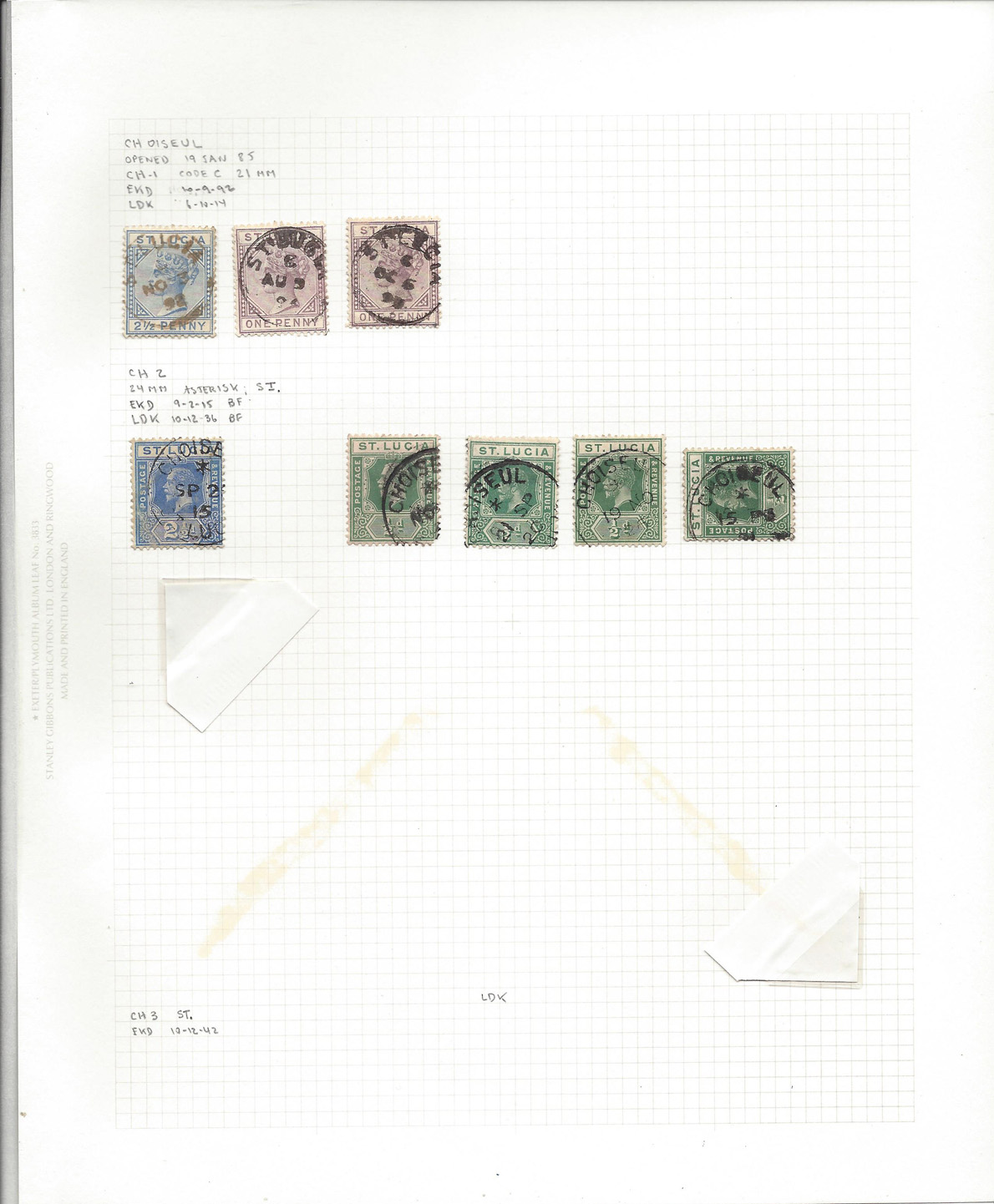 QV//KGV Collection of over 75 stamps on 8 album pages cancelled at 10 different post offices, Anse-la-Raye, Canaries, Gros Islet, “C”, “D”, “L”, “M”, “S”, Patience and “VF”. A number of attractive, full strikes, some on piece, many annotated. Mostly KGV but one KGVI and 5 or 6 QEII. A very nice group. F-VF. PHOTO 1 PHOTO 2 PHOTO 3 PHOTO 4 PHOTO 5 PHOTO 6 PHOTO 7 |